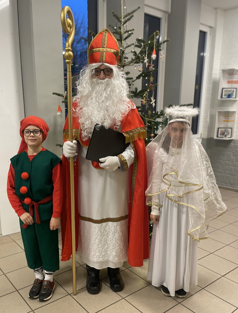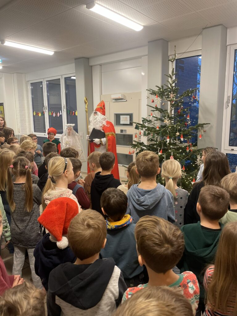 Auch an unserem Standort in Herzlake hat uns in diesem Jahr der Nikolaus besucht. Besonders beeindruckt war er vom gemeinsamen Singen. In der Weihnachtszeit treffen wir uns an jeden Montag mit Klasse 1 und 2 vor dem Weihnachtsbaum und mit Klasse 3 und 4 vor dem Adventskranz um gemeinsam Weihnachtslieder zu singen. Nach diesem stimmungsvollen Einstieg ging es für den Nikolaus und seine Helfer in die einzelnen Klassen. Auch hier war der Nikolaus sehr erstaunt darüber, was unsere SchülerInnen alles können. Es wurden Gedichte vorgetragen, Lieder gesungen und Bilder gemalt! Da hatte der Nikolaus gar nicht mehr viel Arbeit und musste nicht viel aus seinem goldenen Buch vortragen außer einem großen Lob an die Kinder. Von den Helfern gab es dann für jedes Kind noch einen Schoko Lolli und eine Nektarine! Vielen Dank an den Förderverein für die Unterstützung und an den Nikolaus und seine Helfer für Ihren Einsatz!