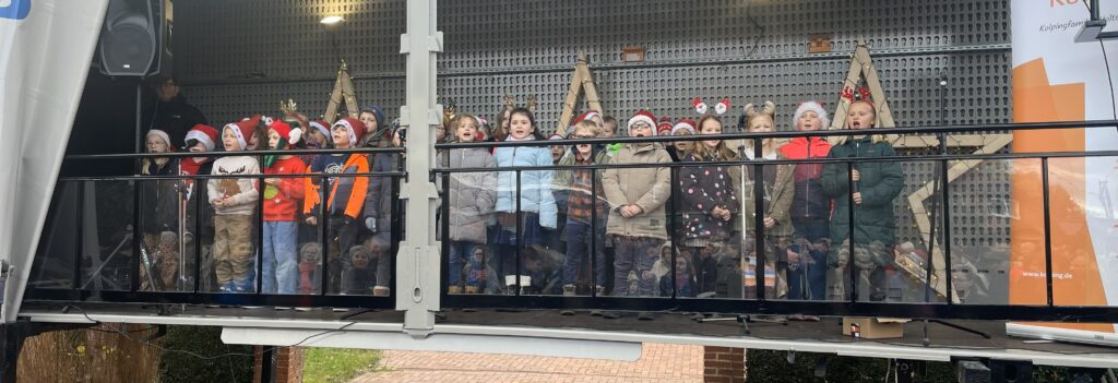 Auf dem Holter Weihnachtsmarkt am 30.11.2025 haben die Schülerinnen und Schüler der Klasse 2 mit ihren Klassenlehrerinnen Frau Große Pöhler und Frau Tebbe durch ihren gesanglichen Auftritt dem Weihnachtsmarkt noch mehr festliche Stimmung gebracht. Gemeinsam wurden Weihnachtsklassiker wie „In der Weihnachtsbäckerei“ auf der Bühne zum besten gegeben. Ihr habt einen starken Auftritt hingelegt, das war super! Die Kinder aus der Klasse 3 und 4 haben im Stand des Fördervereins beim Verkauf des Apfelsafts, der gebastelten Weihnachtsgeschenke (Servietten, Karten, Seife und Schlüsselanhänger) sowie Popcorn geholfen. Es wurde viel Geld für den Förderverein eingenommen! Wir möchten uns bei allen Helfern bedanken!